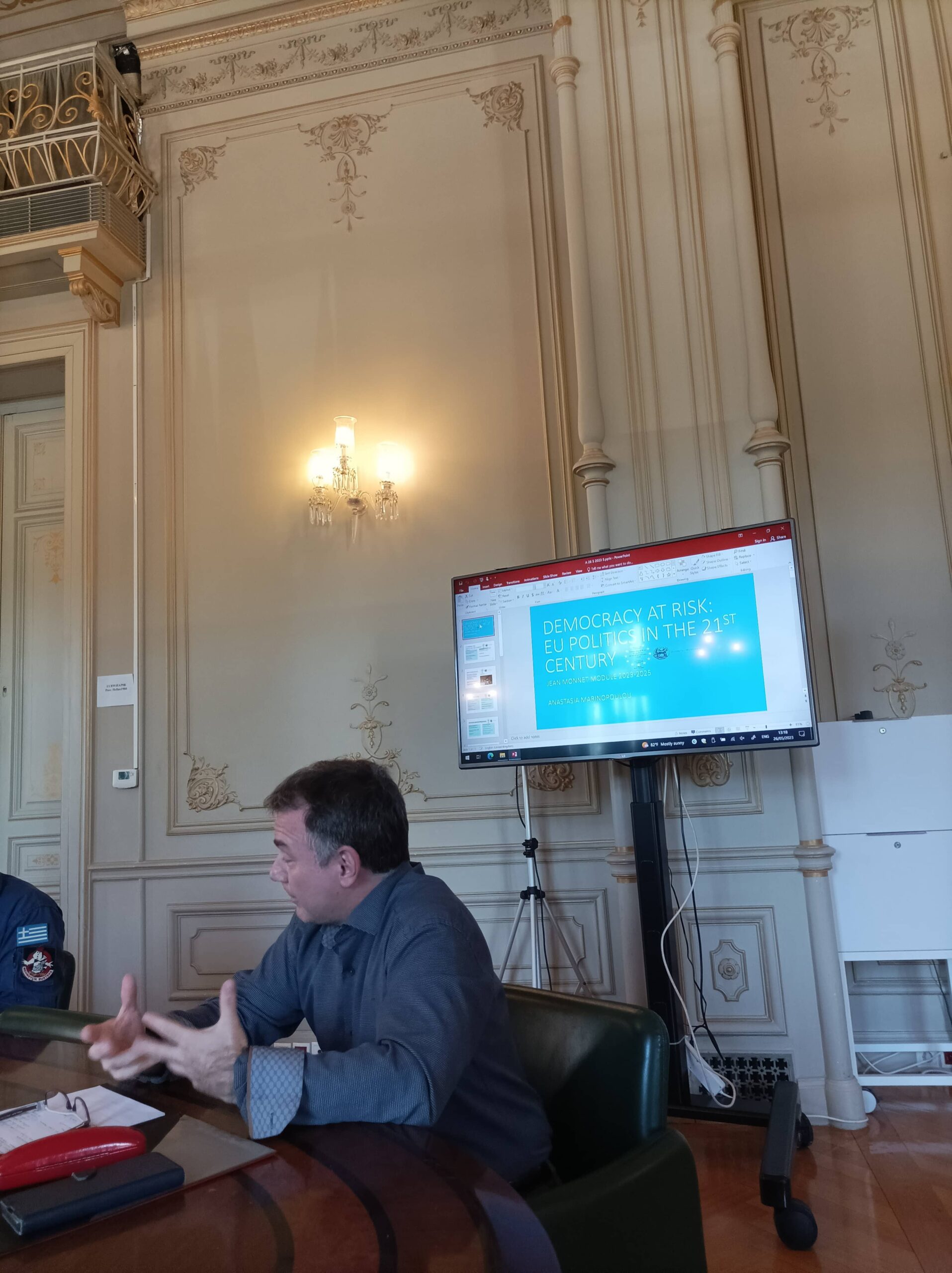 Το πρώτο σεμινάριο των μαθημάτων του προγράμματος Project Democracy at Risk: EU politics in the 21st century πραγματοποιήθηκε στα γραφείο του Ευρωπαϊκού Κοινοβουλίου της Αθήνας τη Παρασκευή 26 Μαΐου 2023. Το σεμινάριο πραγματοποιήθηκε από την κύρια ερευνήτρια του έργου Δρ. Αναστασία Μαρινοπούλου και είχε θέμα “Ιδιότητα του πολίτη”.